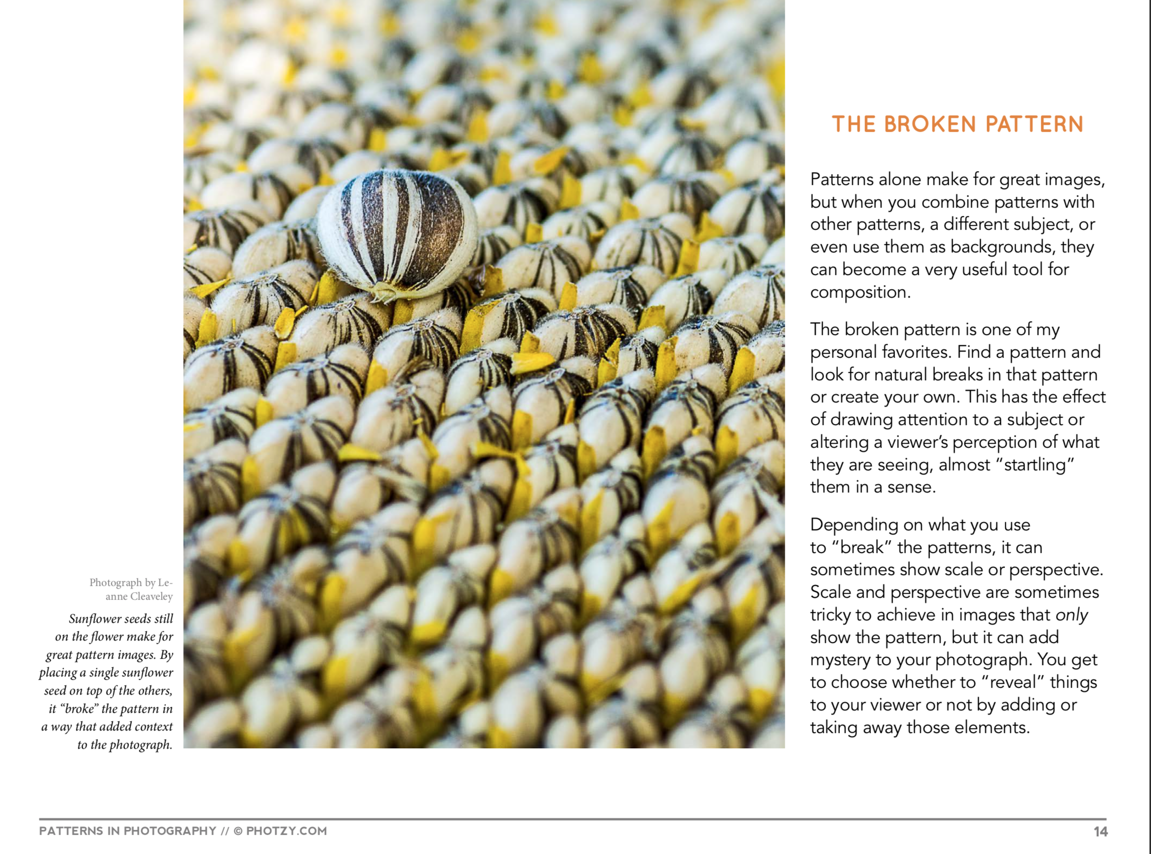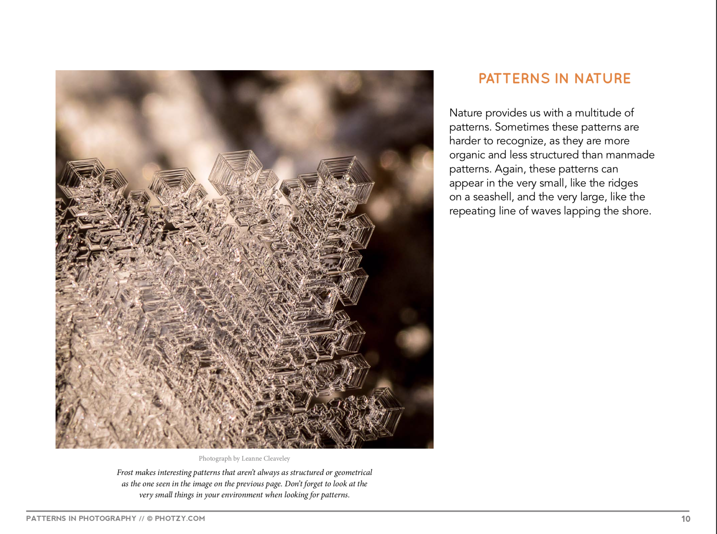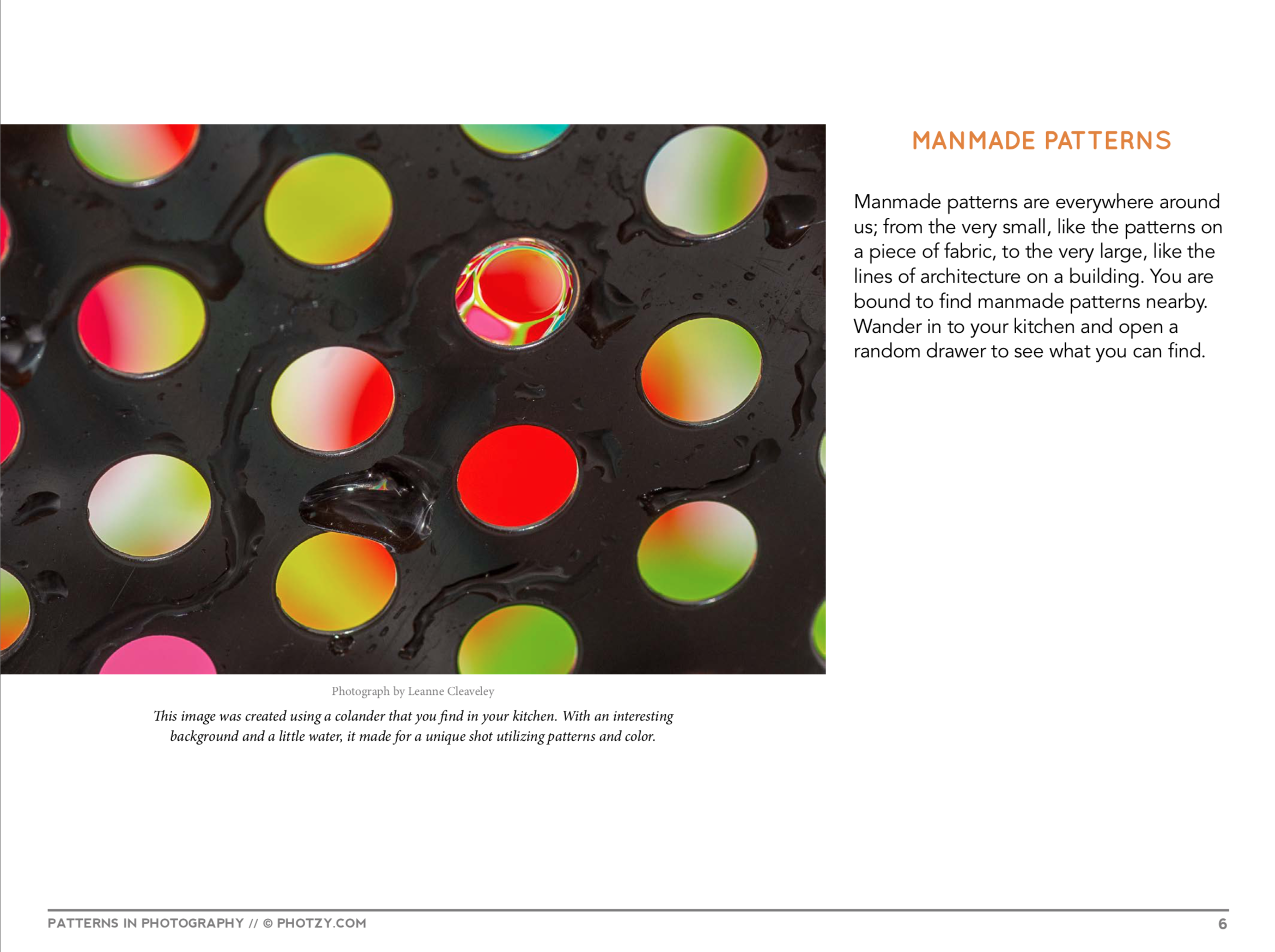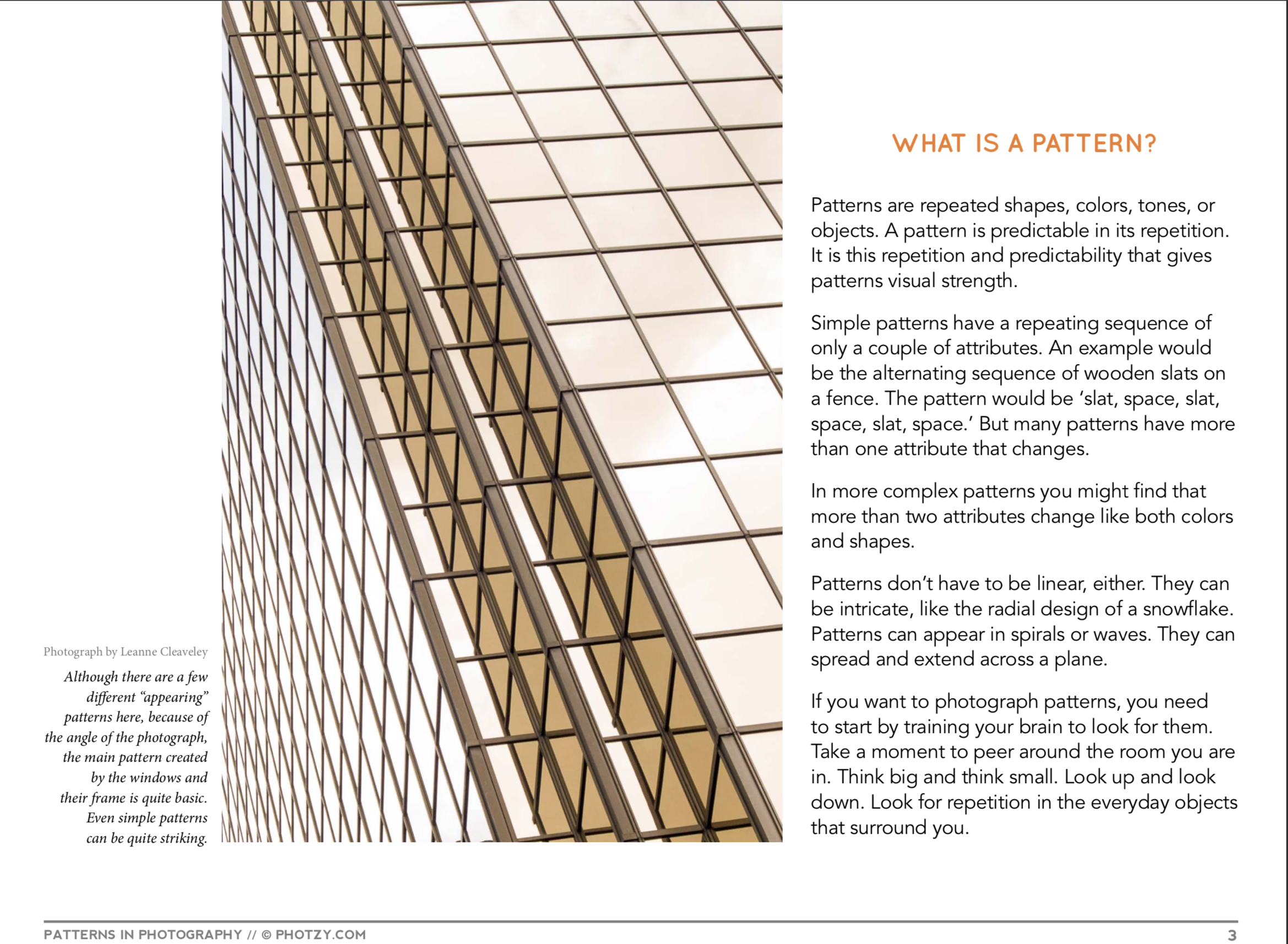 For my online class on photograph, I took one from photzy.com called “Patterns in Photography”. This taught me how to photograph patterned objects and what to look for in the patterns. Photographing patterns can be difficult because it is hard to know which ones are good and will be able to be seen clearly in a photograph. I also learned there are different types of patterns we should look for. These include manmade patterns, nature patterns, broken patterns, and patterns we make ourselves. Some patterns, like ones found in nature, can be so simple but also come out very clearly and nice. The powerpoint also talks about having to use different angles when photographing patterns. Some angles may look better than others and may capture it much more clearly. This taught me a lot because having very little experience in higher quality photography I do not know what patterns to look for and how to make them look appealing. Now however, I have learned what to look for and how to get it so that the photograph comes out how I would want it to. Here are some screenshots from my lesson on the things I found most interesting and helpful:
