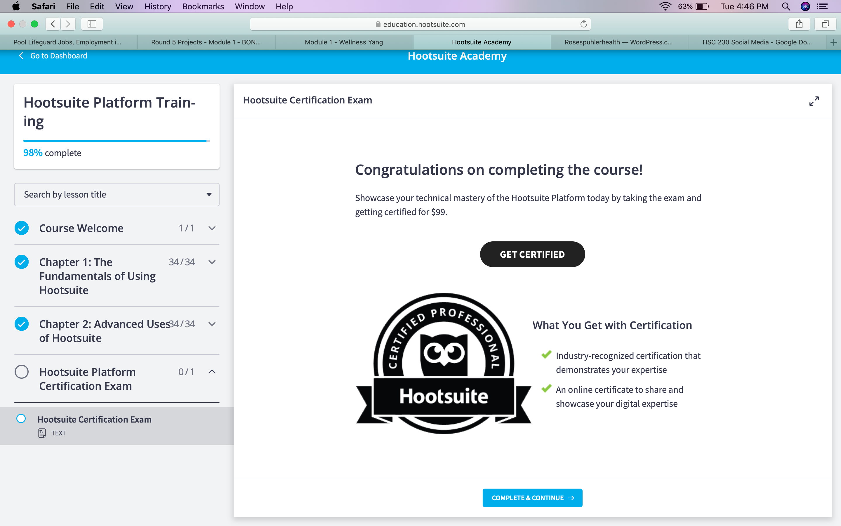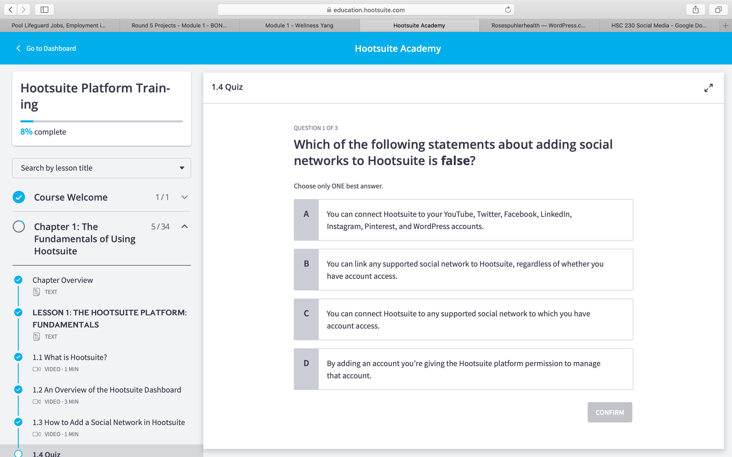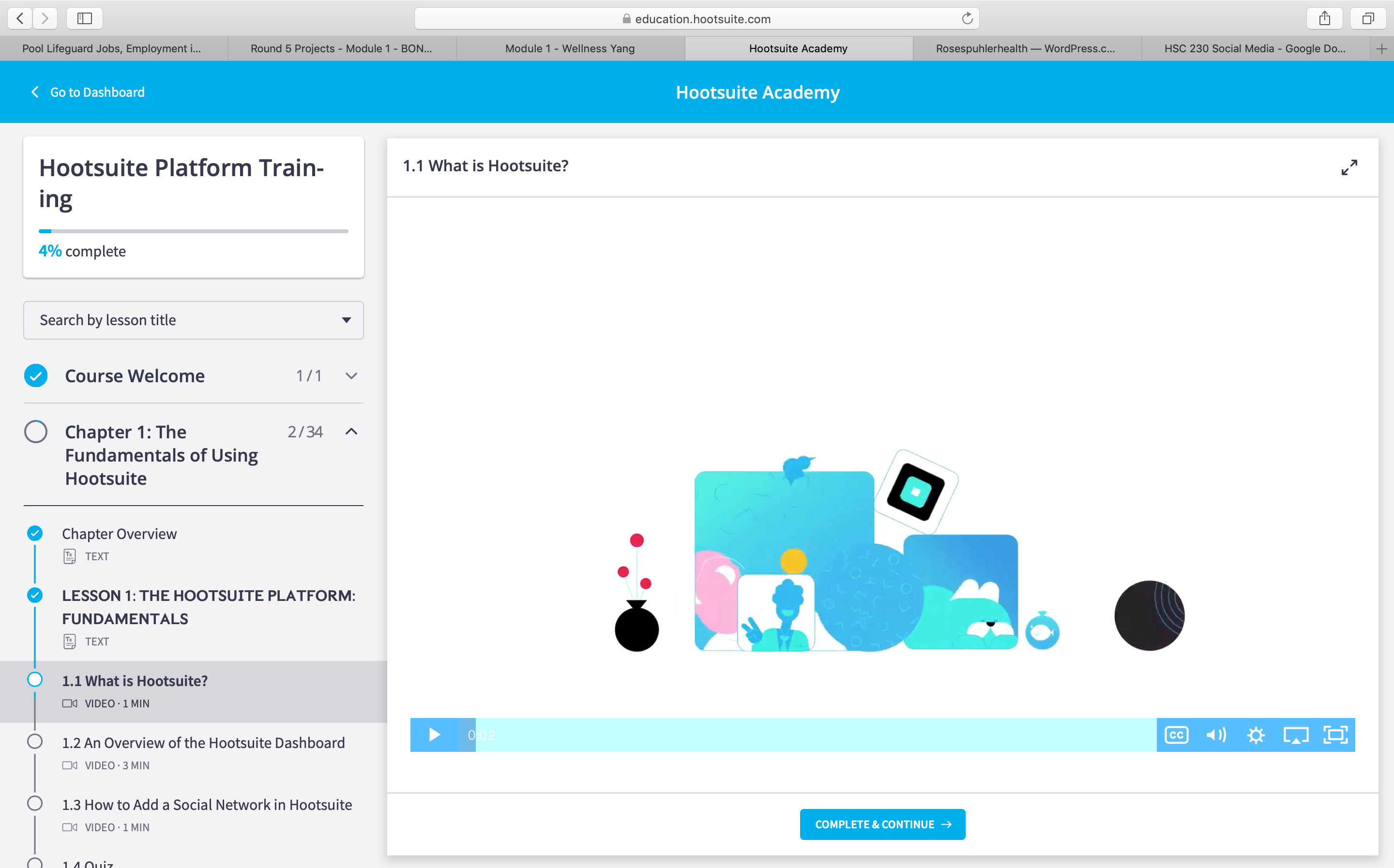 I also took the Hootsuite social media course and completed that and got a certification! I learned the benefits of using Hootsuite and how it can make managing social media easier. There were quizzes at the end of every chapter to ensure I learned everything I needed to in that chapter. Below are some screenshot of the course!