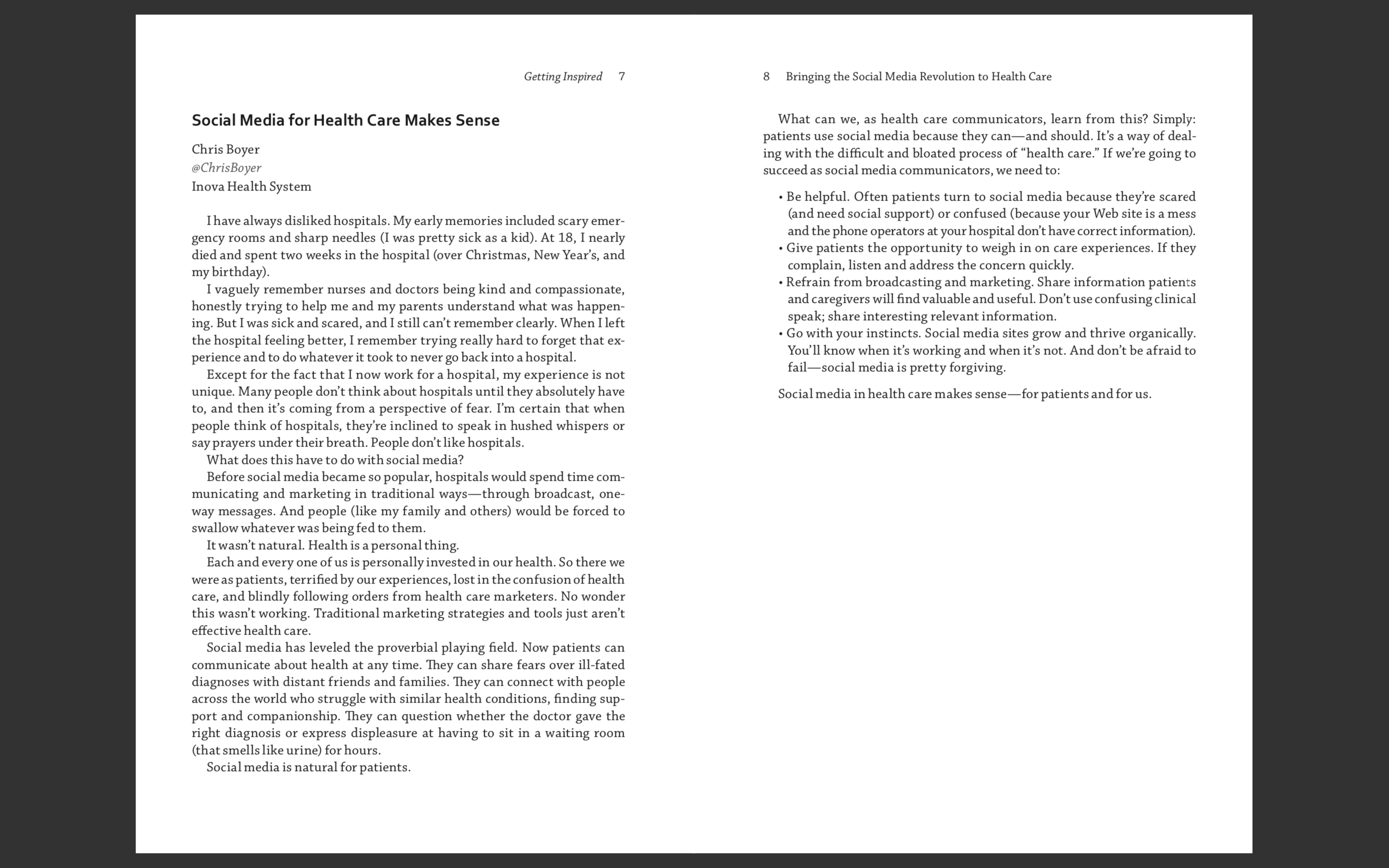 “Bringing the Social Media Revolution to Health Care”. I focused mainly on the article “Social Media for Health Care Makes Sense” because I felt it pertained to my major and field of interest, so it would be good information for me to learn. This part of the guide discusses how beneficial social media and technology is on health. People can now check themselves at home instead of needing a doctor appointment every week, and can even send the information from their technology over to their doctor office making it easy for patients to communicate what is going on and for doctors to check. It also simplifies the work of the doctors and nurses, especially in hospitals where things need to be quick. Doctors can check patients bodies quicker than they could before and even get more detailed screenings. Many people use social media to diagnose themself rather than going to the doctors for a checkup. This can be both beneficial and dangerous. By going to social media and typing in your symptoms, you can find what could potentially be the issue. Then, you should make an appointment and tell your doctor what you have found if it is serious enough for a checkup. The negative to this is that many times we type in our symptoms and find that it could be some terrible disease or a type of cancer, and next thing you know you think you’re dying over a common cold. If technology and social media are used correctly, there can be a huge benefit on the health care system.