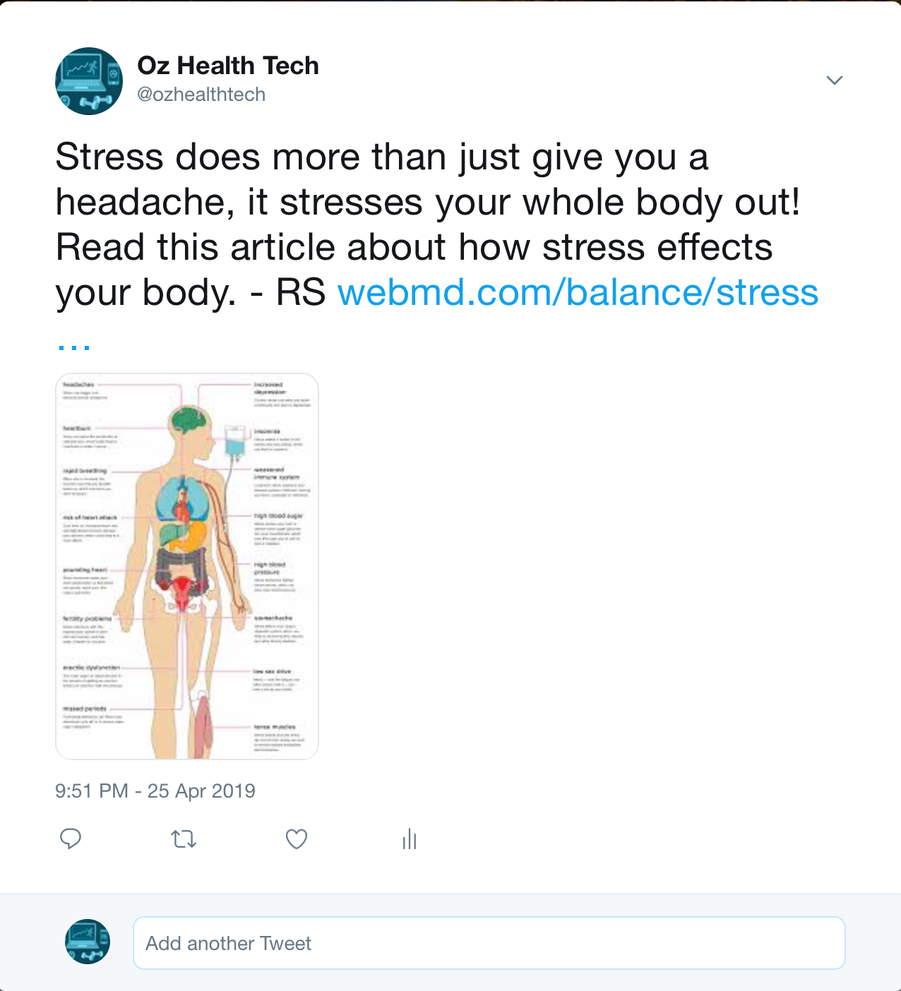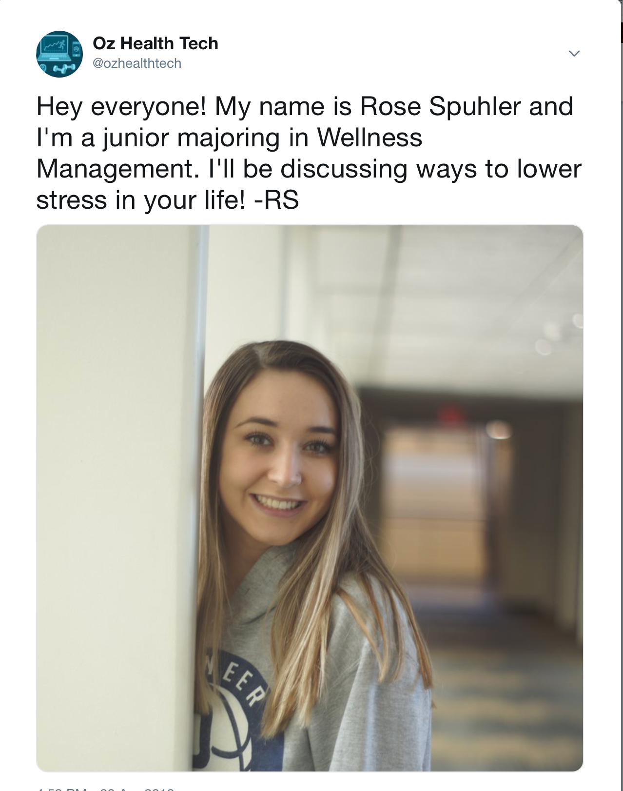 I started off this project on April 23, 2019 with 224 followers and I have reached 225 by Sunday April 28, 2019. As of today, I have posted an introduction tweet, three of my own tweets about stress, and one retweet. I’ve enjoyed posting and informing the followers of the page about stress and ways to reduce it, especially with finals week coming up!