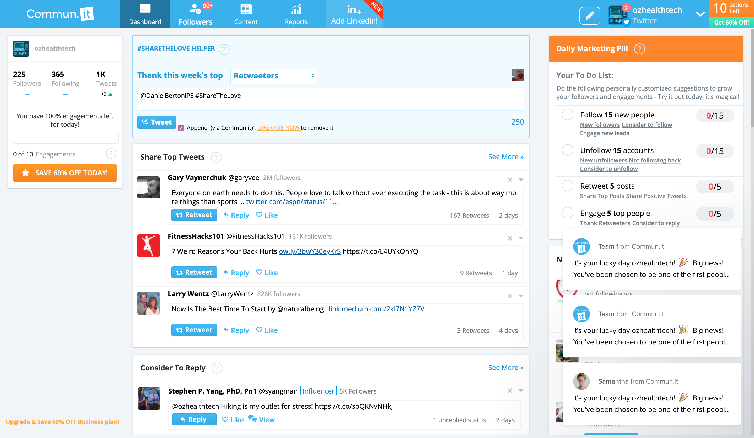 Another tool I used during this project was “Commun.it”. This is a program that schedules your tweeting patterns for you and tells you when to post. This is great for someone who is very busy running a company because Commun.it reminds you to post, and if the tweet is already there it will post it for you!